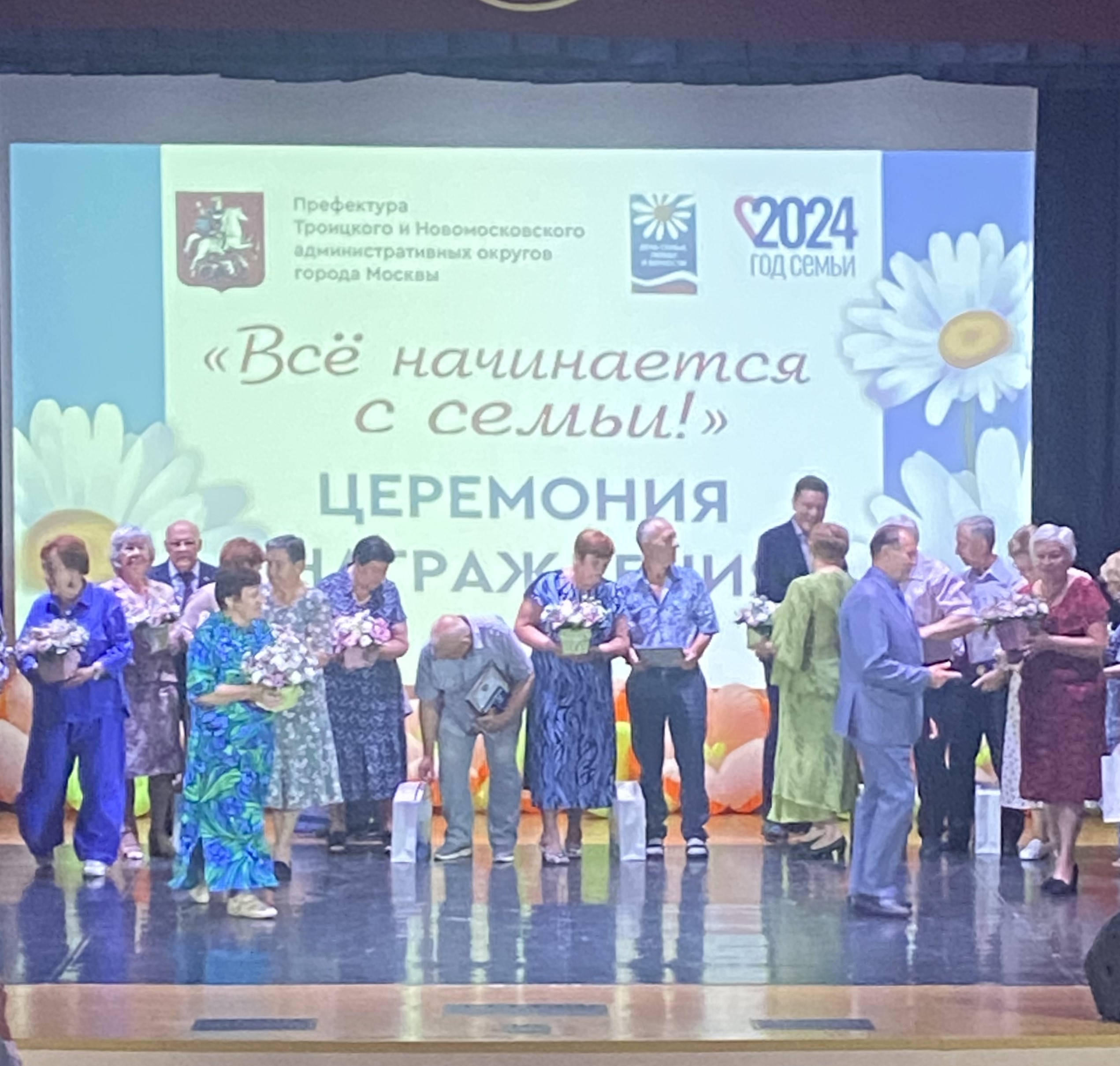 В самом начале мероприятия на сцену были приглашены семейные пары из поселений ТиНАО г. Москвы. Все эти пары прожили в браке не менее 45 лет