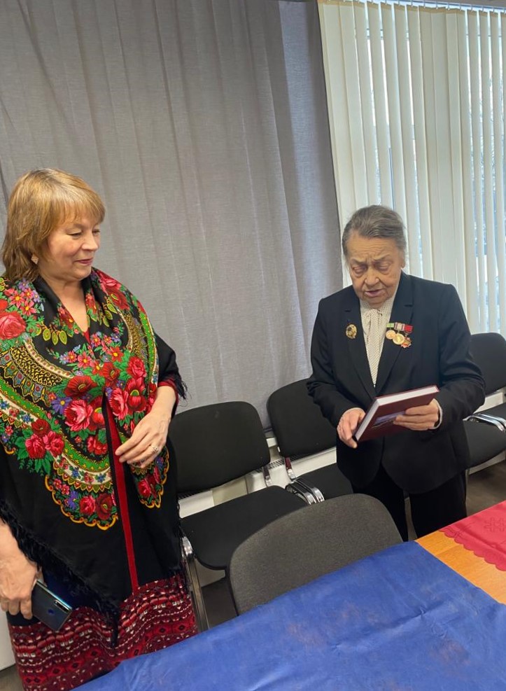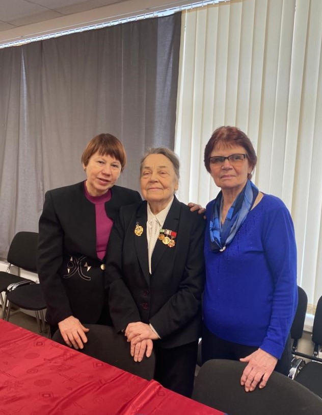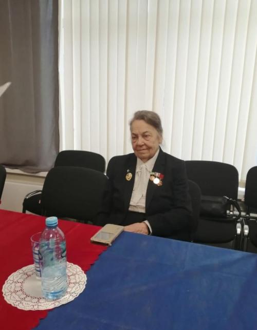 Вера Ивановна поделилась с ветеранами своими воспоминаниями. Когда началась война ей было 4 года и 4 дня. Её мама была сотрудником НИИЗМ (будущий ИЗМИРАН), который был эвакуирован в Троицк. А Вера Ивановна с мамой и бабушкой в 1943 году, когда была проложена «Дорога жизни» через Ладогу, были эвакуированы в северный Казахстан к брату мамы.